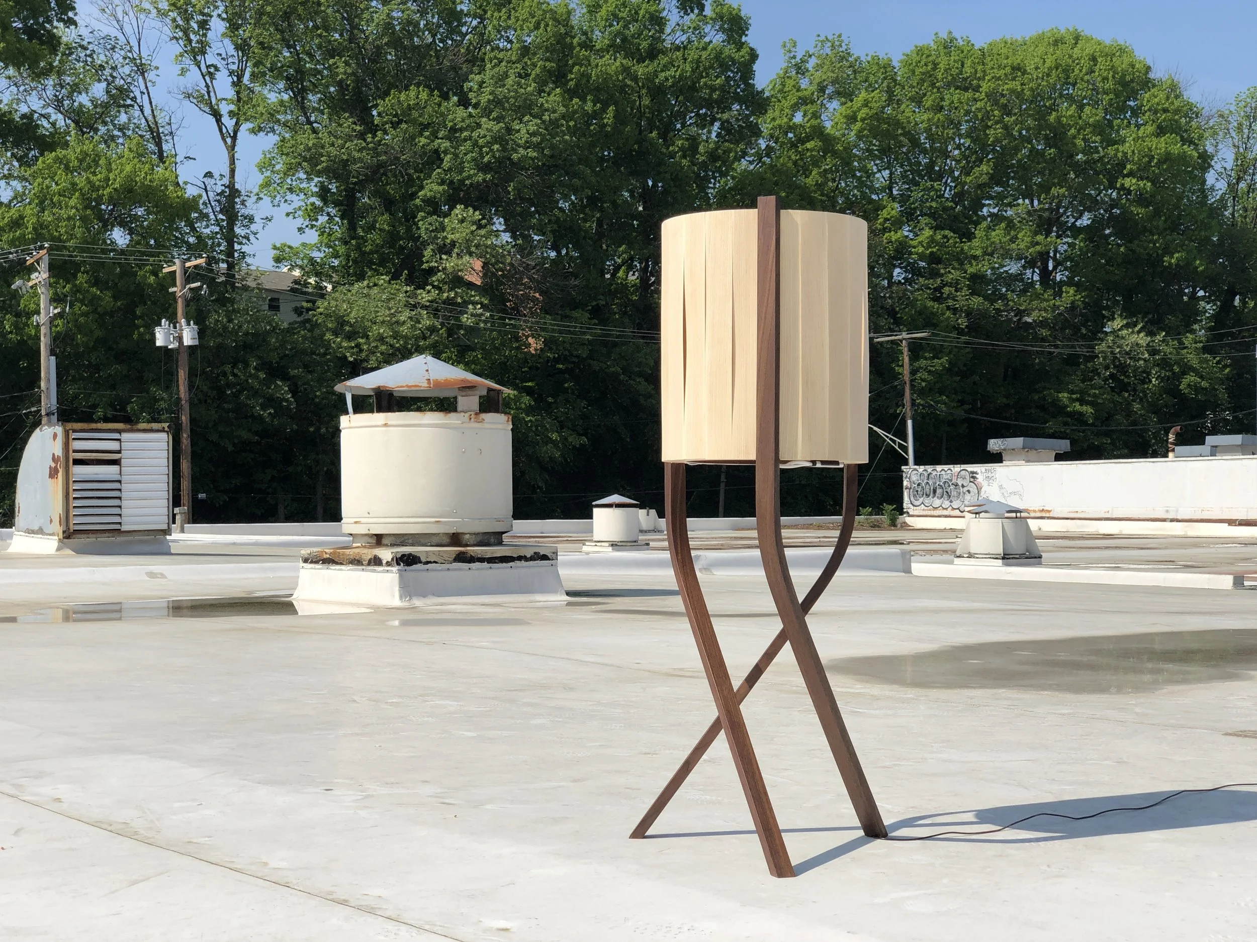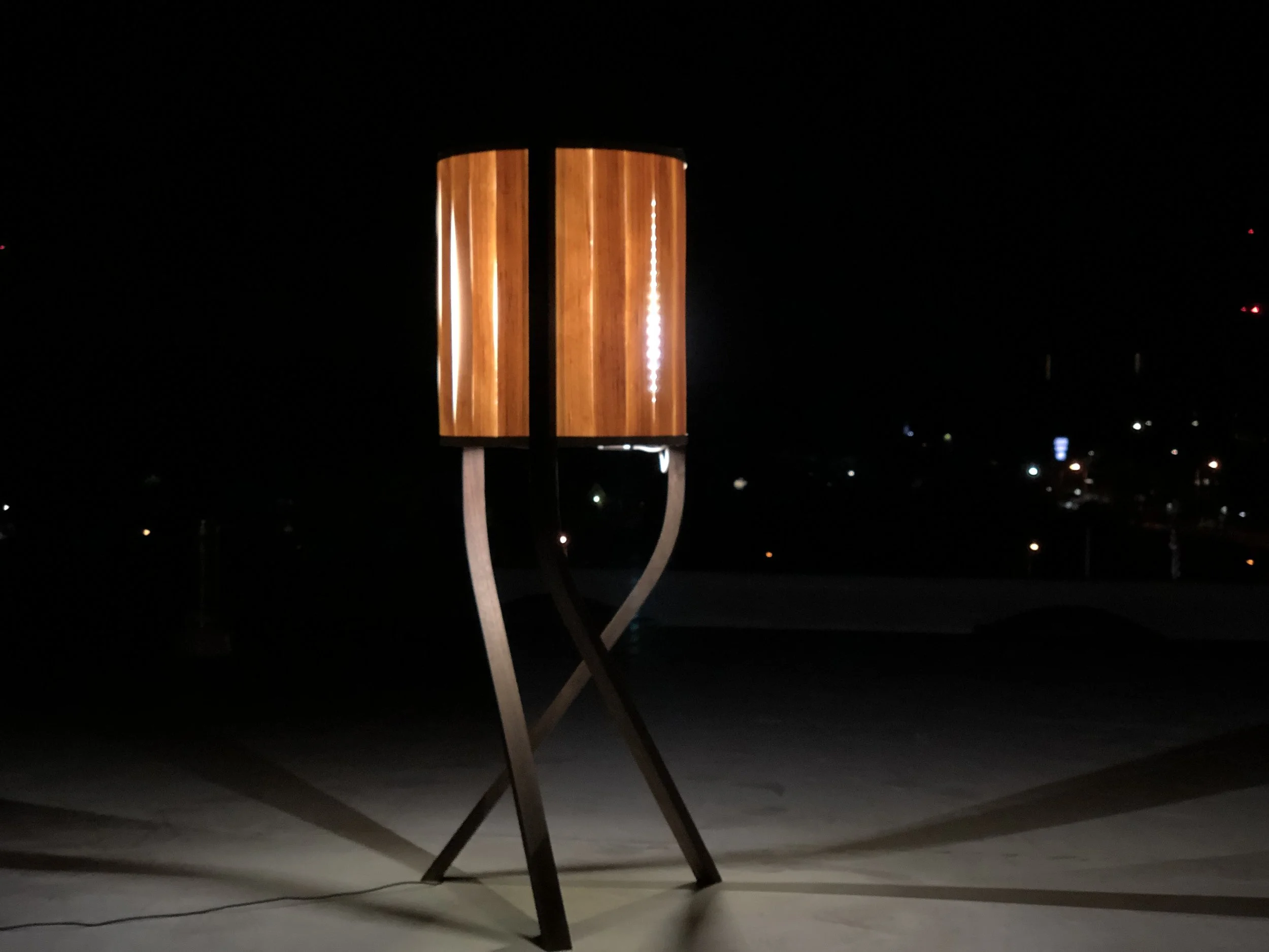 This lamp is built predominantly with black walnut and white ash. The design is to function as a sculpture when not in use, but also work as a mood lamp when desired.