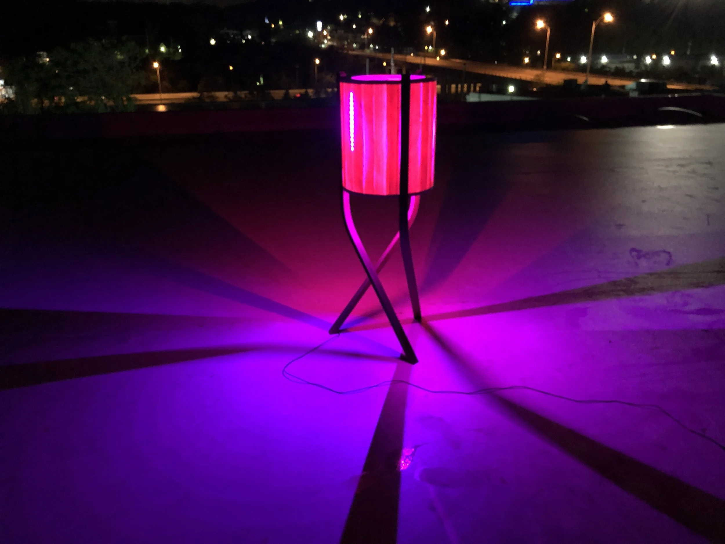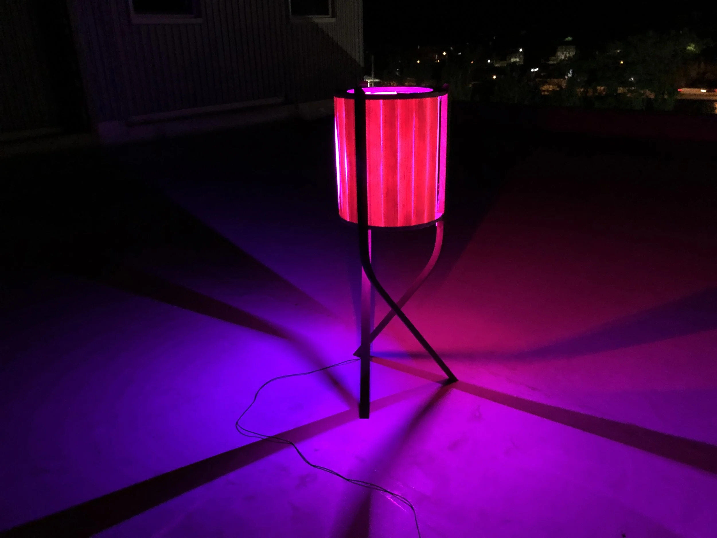 The LED’s are RGBW and is controlled with your smartphone via WiFi. Each strip is oriented so that it can project into the open spaces between the bent legs providing even light. Power cord is concealed in leg for a clean aesthetic.